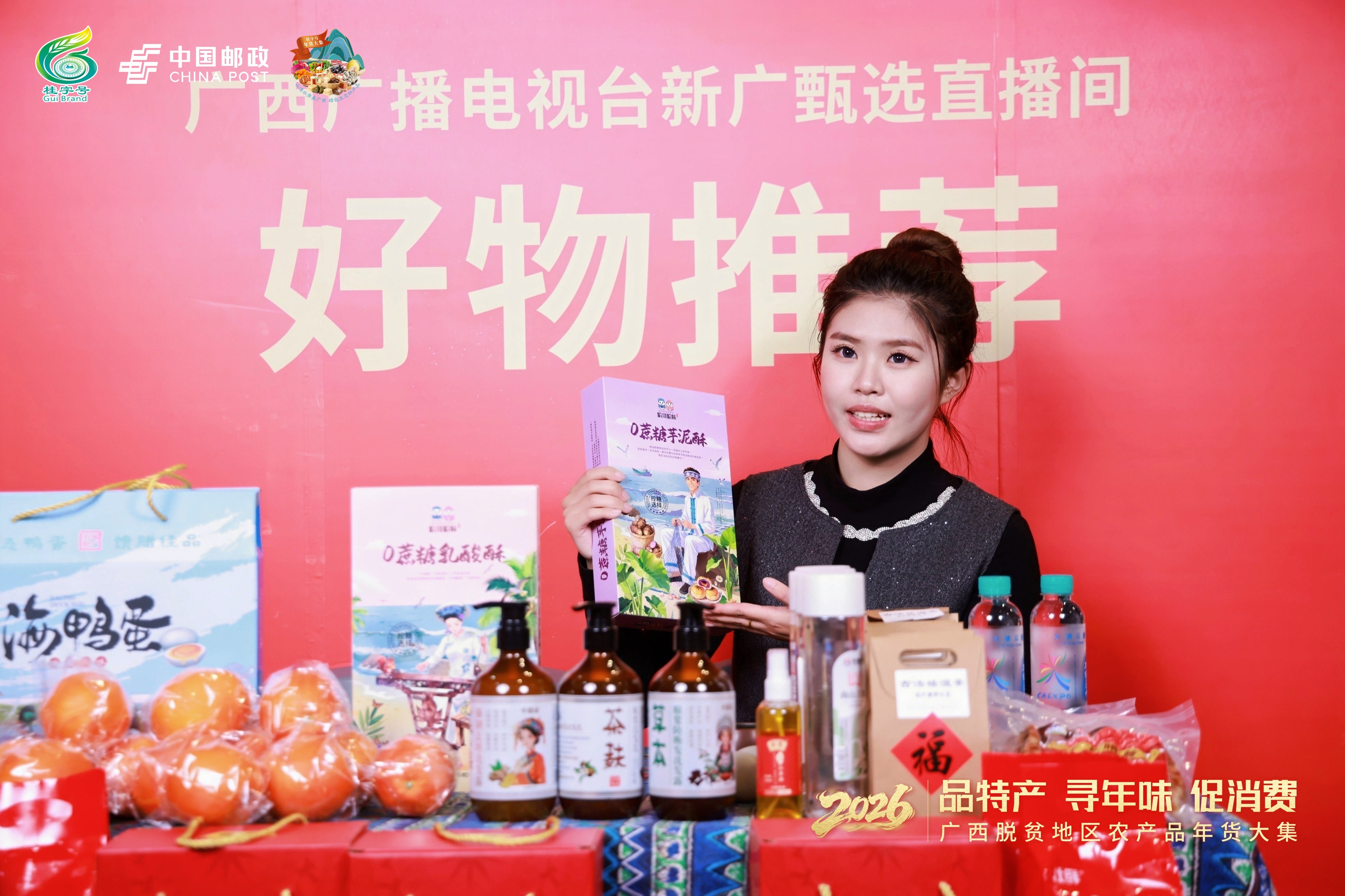 活动现场易云达,特色农产品推介环节成为一大亮点。多家企业代表依次开展“我心中好年货”产品推介,全方位介绍了广西农产品的优良品质与特色风味,中国邮政广西分公司渠道平台副总经理劳小蔡也同步分享了广西邮政服务乡村振兴的平台政策,赢得现场观众阵阵好评。